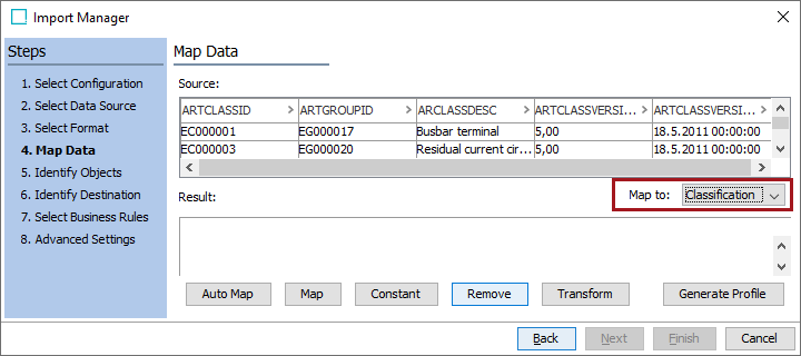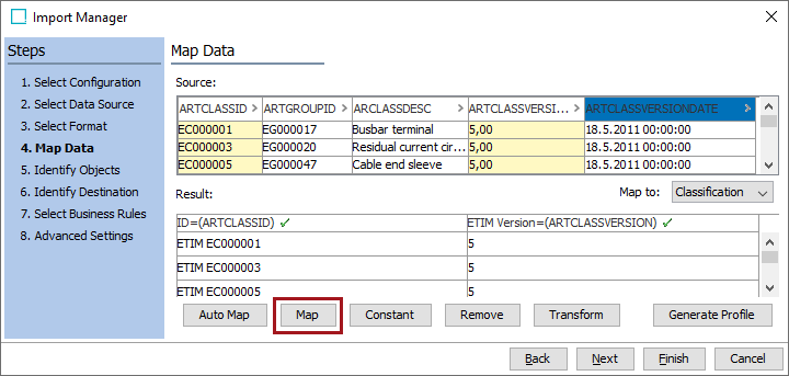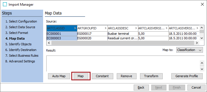 - In the Source table, select the ARTCLASSID column and click the Map button below the Result table.