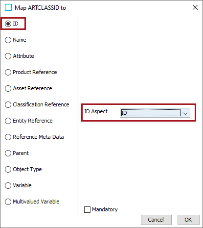 - In the Map To window, select the ID radio button, set the ID Aspect to ID, and click OK.