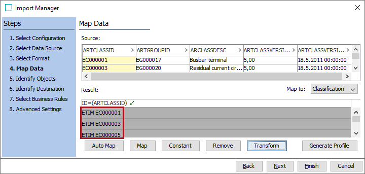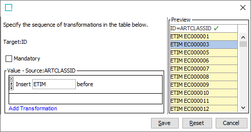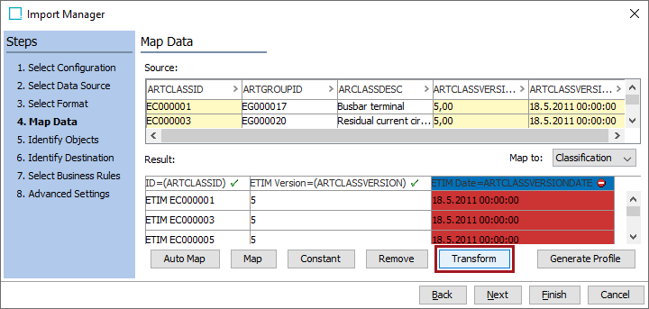 - The ETIM Date attribute has a validation type of 'ISO Date and Time' format, it does not match the format in the ETIM file, so it displays as an error in the Result table. Select the ETIM Date=ARTCLASSVERSIONDATE column and click the Transform button.