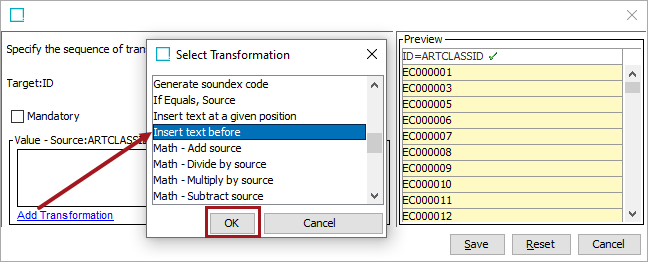 - In the Transformation dialog, click the Add Transformation link, select the Insert text before option, and click OK.
