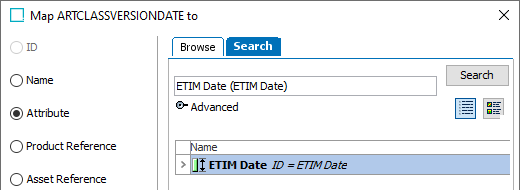 - In the Map To window, select the Attribute radio button, search for and select the ETIM Date attribute, and click OK.