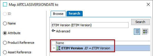 - In the Map To window, select the Attribute radio button, search to find and select the ETIM Version attribute, and click OK.