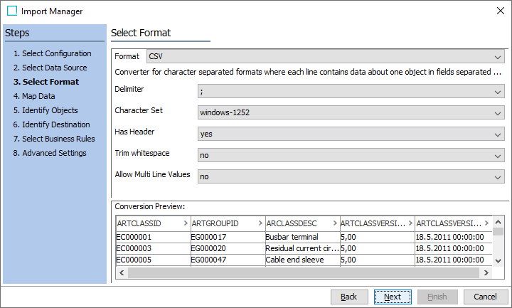 - On Import Manager Select Format, choose CSV and leave the other settings as default. The Conversion Preview is displayed.