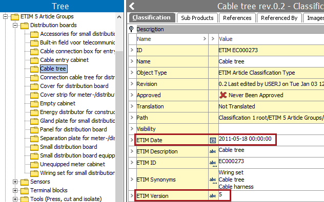 - When the import completes successfully, the transformed values are displayed for all ETIM Article Classification object types for the attributes ETIM Date and ETIM Version.