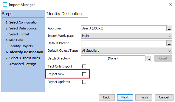 - Determine how to set the Reject New checkbox and click the Finish button: