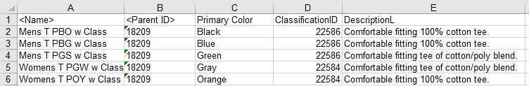 The following sample Excel data import file shows that the first row is a header, and the remaining rows are import data. Exported Excel files always include a header row, though this is optional for imports.