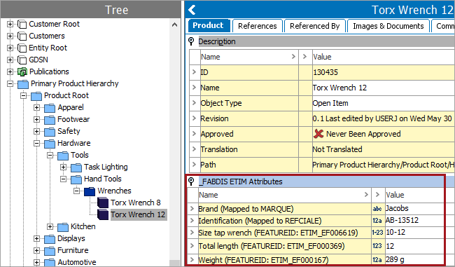 The following attributes are assigned to the '_FABDIS ETIM Attributes' group, and include values for the selected product. To clarify the mapping and output displayed within the images below, mapping information has been added to each attribute name in parentheses.