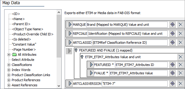 - ARTCLASSID (text) is the ETIM class ID, which can be an attribute on the product or the classification link. For the classification link option, use the Multi Level References data source (and the Referenced node attributes option) to access an attribute on the classification that holds the ETIM ID, or optionally use a transformation to extract the ETIM ID directly from the STEP ID. For more information, refer to the Multi Level References - Data Source Outbound topic in the Data Exchange documentation and the Transformations topic within the Resource Materials online help documentation.