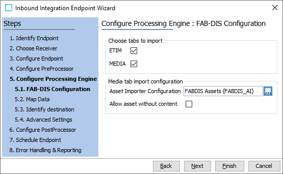 For an IIEP, the FAB-DIS Configuration step of the FAB-DIS Importer processing engine includes checkboxes for selecting the data to be imported. These checkboxes determine the mapping options available in the following Map Data step.