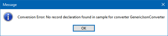 The source file includes actual data, but must include instructions to represent the data instead. To identify missing instructions, click the Sample reload button and a message is displayed about a missing record declaration: