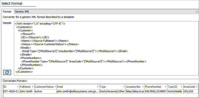 The following is an example of an XML Import for a customer record that contains an ID, Name, Status attribute, which uses [?Source?] instructions, while the Email Addresses and Phone Numbers nodes are mapped to data containers in STEP using the [?MultiSource?] instruction in the XML template below.