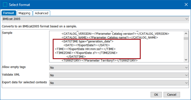 - The <?ExportDate HH:mm:ss?> processing instruction, located between the <TIME> tags, produces the time of the export, in the format determined by the specific parameter (HH:mm:ss).