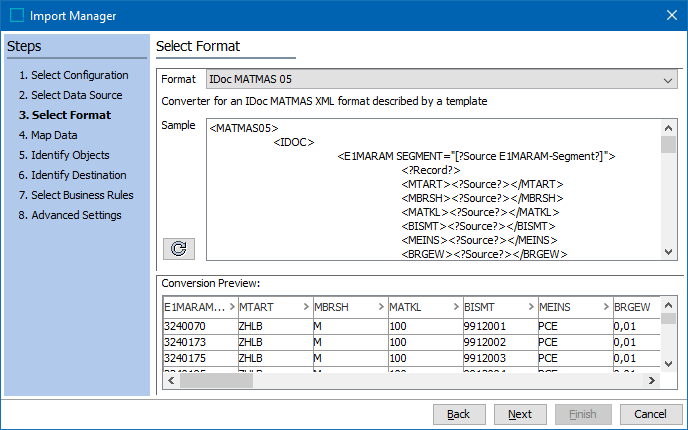 After importing the required SAP attributes into STEP, then use a source sample file from the SAP system to import values for the products. Mapping is required to identify where the values will live in STEP, and may also include data transformations.