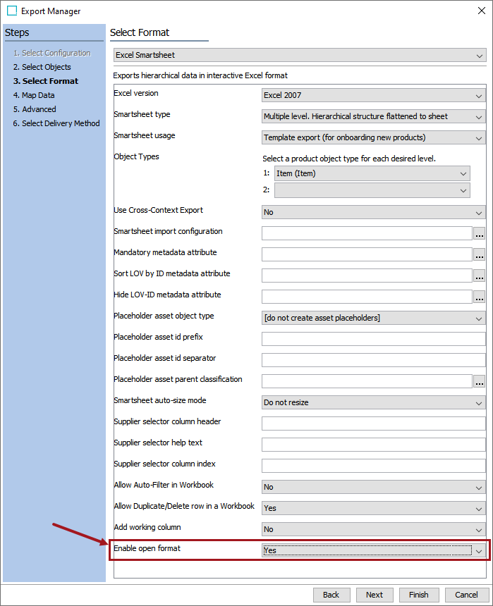 To export an open format Smartsheet, choose 'Yes' for the Enable open format parameter on the 'Select Format' screen of the Export Manager wizard. The default value is No. For full details on how to configure Smartsheet export configurations, refer to the Smartsheet Data and Template Configurations topic.