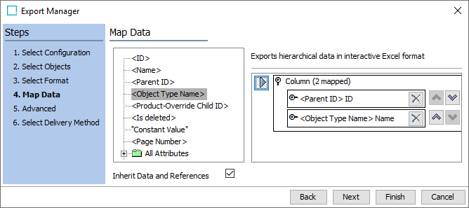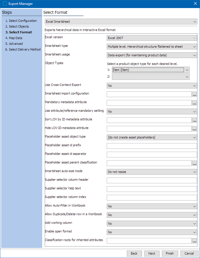 - For multi-level Smartsheets, specify the object type of the products for each level in the multi-level export. The object type must be valid for each level. The top level must be allowed under the root product selected in the Select Object step of the wizard. A maximum of five (5) entries are allowed.