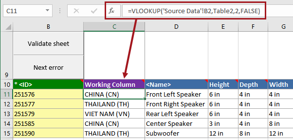 - For the Add working column parameter, select 'Yes' to add a working column to the Smartsheet. The working column allows users to enter Excel formulas, which are restricted from other data cells in the Smartsheet. A common Excel function used within the working column is VLOOKUP.
