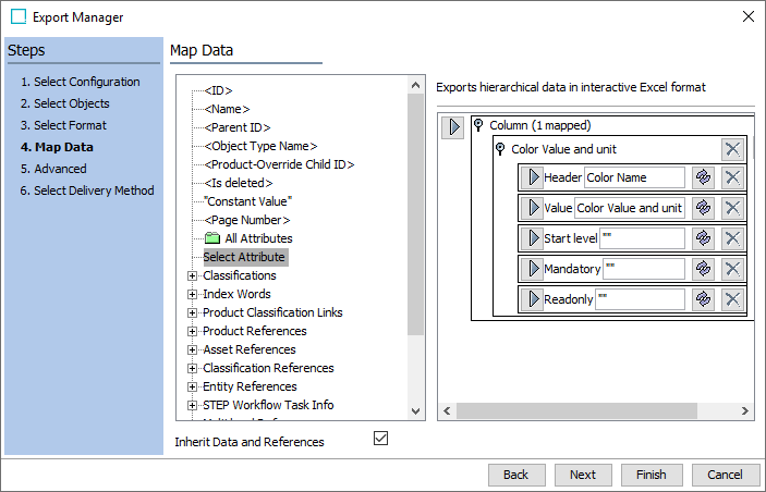 - For the Classification roots for inherited attributes parameter, the Export Manager determines the valid attributes for new products in the product category if a Product Classification Link type allows for inheritance of attribute validity from the linked classification. These attributes will be included in the Smartsheet output. For full details on this functionality, refer to the Classification Roots for Inherited Attributes topic.
