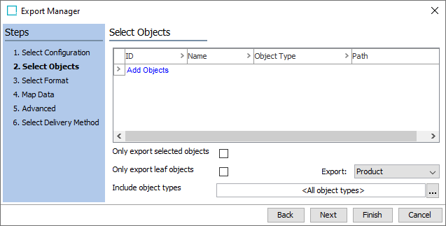 - Enabling Only export leaf objects is not recommend since the import may fail, or new products may be created in the wrong place when the resulting template is later used via the saved configuration.