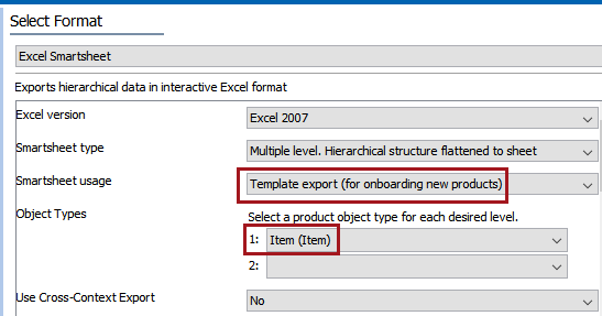 - In this example, the Smartsheet Export Configuration is set to 'Template export' using the object type of 'Item.'