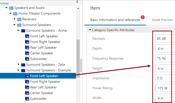 - The example product is an Item object named 'Front Left Speaker.' It contains values for category-specific attributes such as Decibels, Frequency Response, Height, Width, and so forth.
