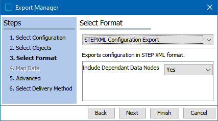The STEPXML Configuration Export format plugin is a utility feature for easily creating a cross-context STEPXML file that contains the full STEP configuration (minus user objects) and the data nodes that are required for being able to import the configuration on to an empty STEP system.