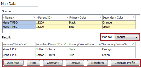 Once mapped, source columns are shown with an yellow background. The result section displays a green check for a data column that has been validated for the object type.
