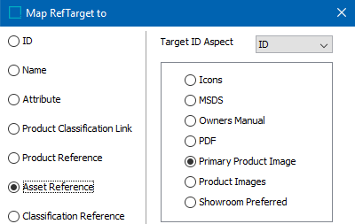 - On the 'Map ... to' dialog, select the Asset Reference radio button to display the list of available reference types on your system. Select the radio button of the desired reference type. Because the Product super type was selected previously, only product-to-asset references are displayed.