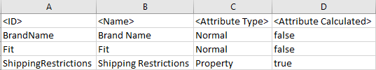 This example shows an Excel import file (although any inbound format can be used). The sample file updates the attribute's Type and Calculated parameters for three attributes. Additional attribute information columns can be added to the import file as needed.