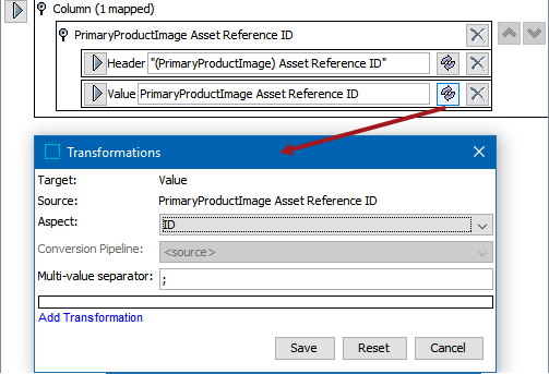 The Aspect option is available for Asset References and allows a variety of data on the asset reference to be exported.