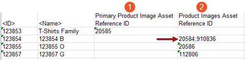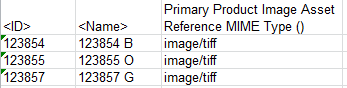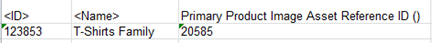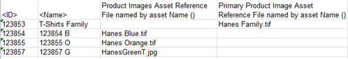 The selected export format file. This file includes product ID, name and ‘Asset reference file named by Asset ID’ as header and asset ID with corresponding asset extension as value for all the exported rows.