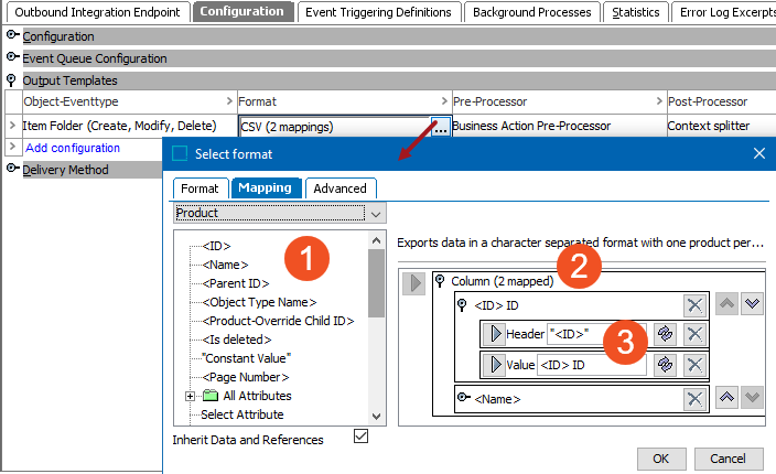 The user interface for the mapping step of the Export Manager tool and the outbound integration endpoint tool are not exactly the same. For Export Manager, mapping is described in the Export Manager - Map Data topic. For OIEPs, mapping is handled in the Output Templates section under the Format parameter as described in the OIEP - Event-Based - Output Templates Section topic or the OIEP - Select Objects - Output Templates Section topic.