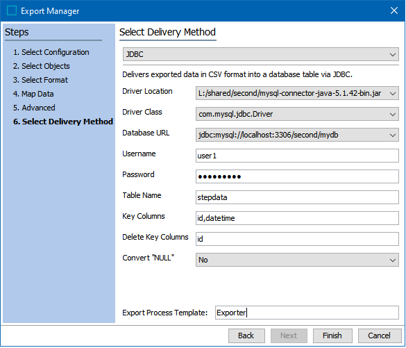 The JDBC delivery method allows STEP data to be delivered directly to tables in Relational database management systems (RDBMS) like Oracle, MySQL, MS SQL Server, and PostgreSQL. Though the ways the JDBC plugin can be deployed are various, one of its prime uses is to send STEP data to data analytics tools for the purpose of displaying STEP data in a data analytics dashboard. This delivery method requires CSV format and is available in both the Export Manager and in outbound integration endpoints (OIEPs).