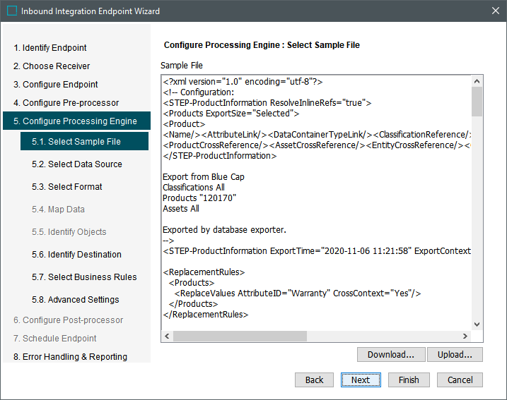 In 5.1 Select Sample File, click the Upload button to upload the sample (representative) file for the files or messages the IIEP will process. This file provides data for mapping (when required) and configures how to import data, and is stored in the database, but is not imported into STEP. If the sample file is Excel, no preview is shown.