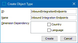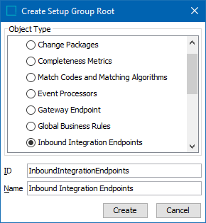 - In the Create Setup Group Root dialog, select the inbound integration endpoints object type, enter an ID and a Name, and click Create.
