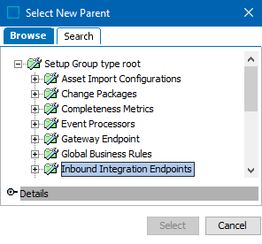 - In the Select New Parent dialog, select the setup group you created, and click Select to make it a valid parent.