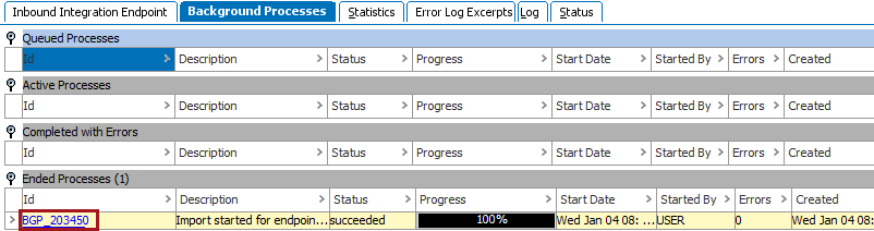 By default, the started integration endpoint background processes are displayed within the IIEP editor on the Background Processes tab, and are not visible on the BG Processes tab.