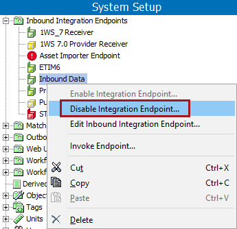 When an IIEP displaying the enabled icon () should be stopped from processing data, you can disable it. The configuration remains unchanged, and no further data is processed. After selecting the IIEP, right-click and select Disable Integration Endpoint to set the IIEP to disabled and display the disabled icon (