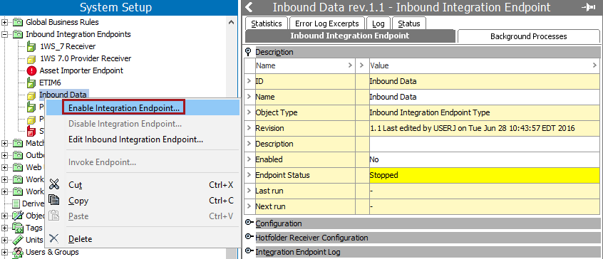 ), right-click, and select Enable Integration Endpoint from the menu.