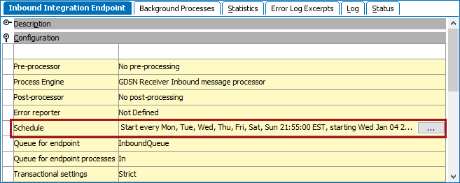 - When invoked on schedule and manually, files or messages available in the location identified by the IIEP receiver configuration are processed. The Integration Endpoint Log section displays the time the endpoint was invoked. For scheduled IIEPs, the log includes a link to the BGP that was started. For more information, refer to the Maintaining an Inbound Integration Endpoint topic.
