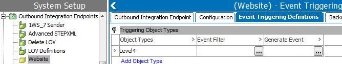 - Apply the business rules to the OIEP on the Event Triggering Definitions tab, in the Triggering Object Types table.