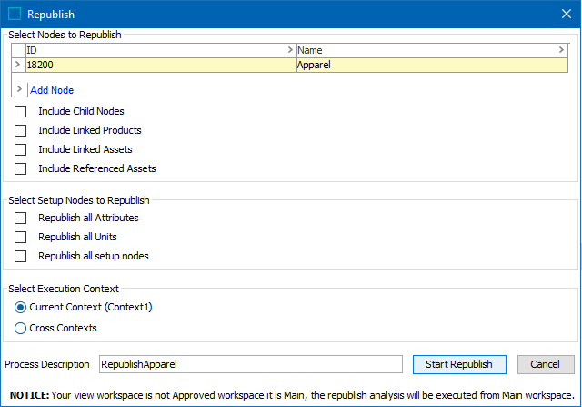 The Republish action generates events on products, classifications, or assets in one or more selected hierarchies. Common setup is to use this option for on-demand creation of republish events. For example, to generate events for all objects in a hierarchy that has never been published by an event queue, or events that were published but the downstream system did not accurately receive the data.
