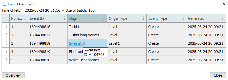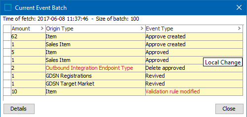 - The Current Event Batch dialog displays the first 100 unread events on the queue. Hover over the Event Type column text for the actual event types being deduplicated if the Event Mode parameter is set to Deduplicate, as discussed in the EP - Event Processor Tab topic.