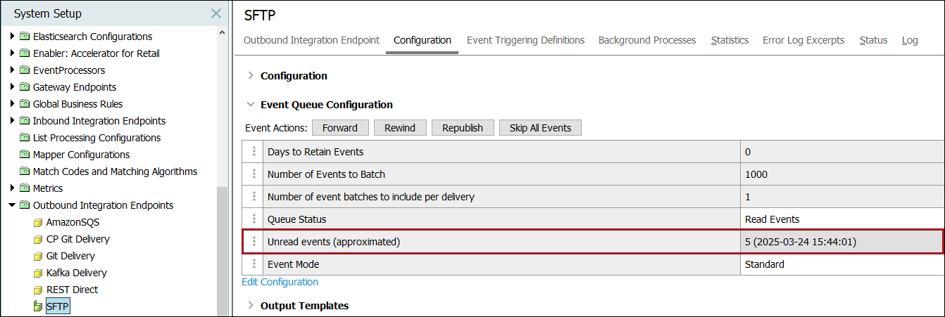 Using the forward, rewind, purge, or republish events options causes the number of unread events on the queue to change. For more information, refer to the Event-Based OIEP Event Actions topic.