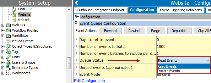 For event-based integration endpoint, the OIEP status (enabled / disabled) setting and the queue status (read events / discard events) setting are independent of each other, but work together to determine how data is processed.