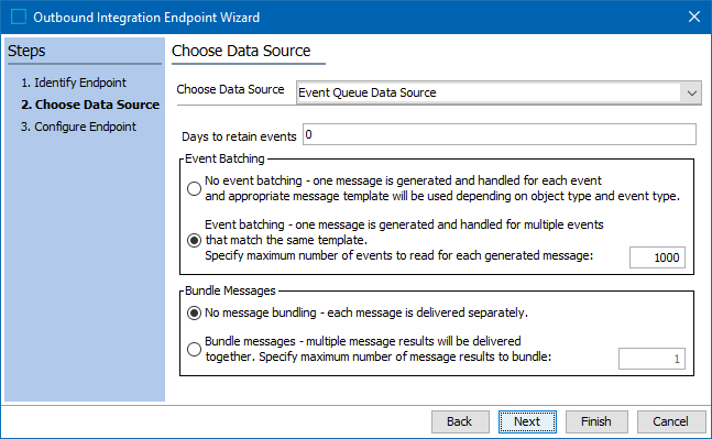 - Choose the data source Event Queue Data Source for incremental exports where data should be published based on events. Creating an event-based OIEP automatically creates an event queue to process events.