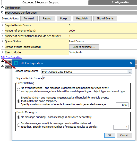 - For information on the 'Number of events to batch' and 'Number of event batches to include per delivery ' (which are controlled by the Event Batching and Bundle Messages parameters on the Edit Configuration dialog), refer to Event-Based OIEP Event Batching.