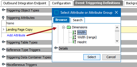 Triggering Attributes are used to filter the data being monitored by the OIEP in conjunction with the Triggering Object Types section. When a Triggering Attribute is defined, and that attribute's value changes for objects of the object types selected in the Triggering Object Types section, events are registered. The 'Triggering Attributes' section is a positive list, so if no attributes are selected, events will not be registered when, for example, a value changes and the object holding the value is approved.