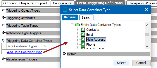 - Click Add Data Container Type, then browse or search for the relevant data container type. When a data container of this type is created / deleted, it will trigger an event for the endpoint.