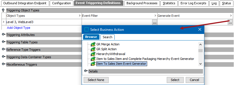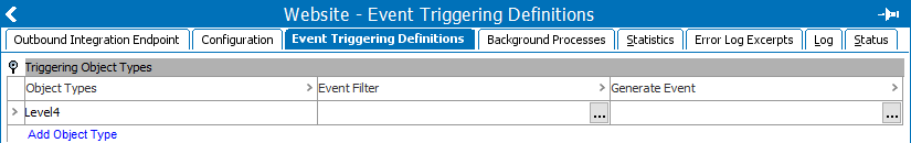 Event triggering definitions define what changes (events) are important and should be monitored by the OIEP or EP. For an OIEP, changes to any element defined on this tab are then formatted based on the output template and ultimately queued for export. For an EP, changes to any element defined on this tab are then handled by the selected core processor. For details about event generation, refer to the Events topic of the System Setup documentation.