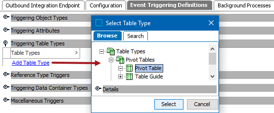 - Click Add Table Type, then browse or search for the relevant table type. Modifications to the table configuration on the product. For example, adding, removing, or modifying the table rows or columns; or changing the data on a free text cell followed by an approval will trigger an event for the endpoint.